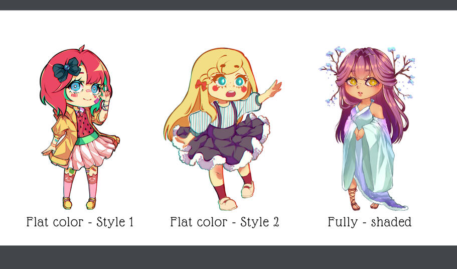 Clothes - 30USD | Flat colors: 20USD | Chibi: 20USD